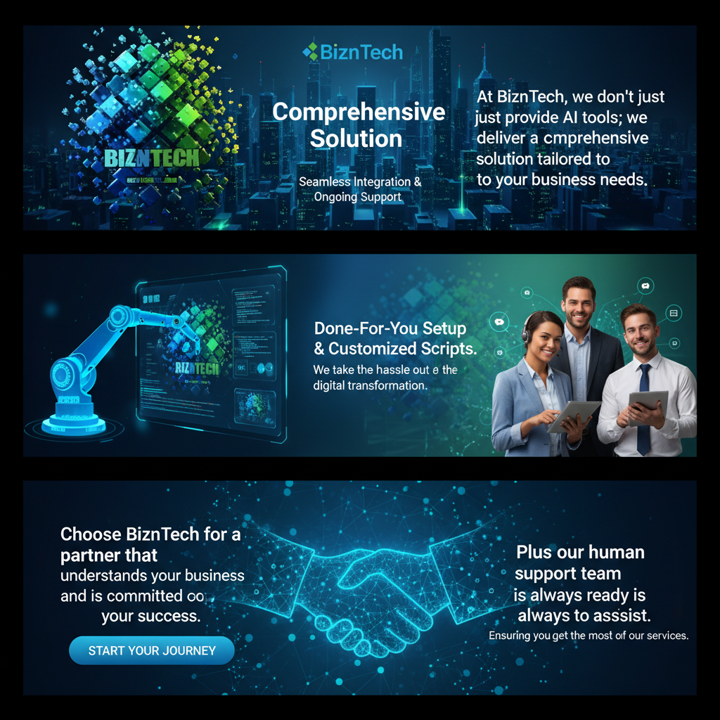 At BiznTech, we don’t just provide AI tools; we deliver a comprehensive solution tailored to your business needs. Our expertise ensures seamless integration and ongoing support, so you can focus on what you do best. With our done-for-you setup and customized scripts, we take the hassle out of digital transformation. Plus, our human support team is always ready to assist, ensuring you get the most out of our services. Choose BiznTech for a partner that understands your business and is committed to your success.